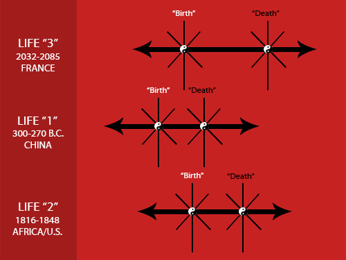 Getting back to our pictures, those three “reincarnational” lives, defined by their births and deaths could be seen linearly: